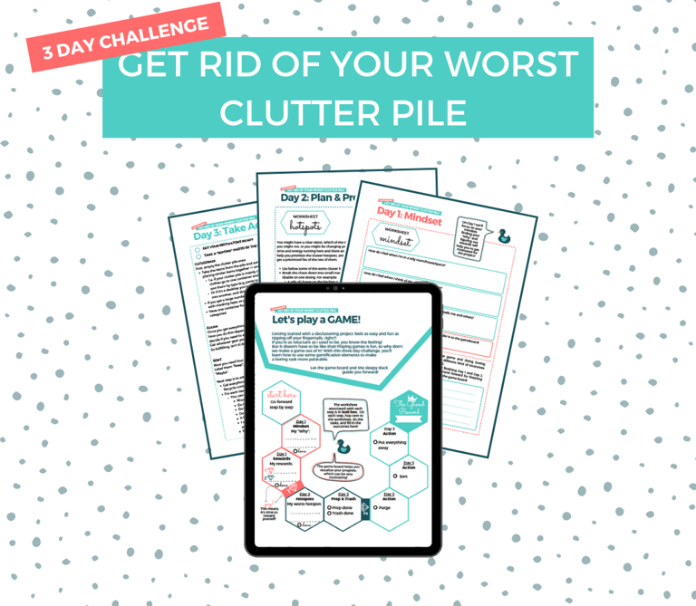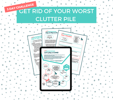 in guided steps to get you quick results without feeling overwhelmed. All this is done in a format of a game, so you'll clear the clutter pile moving along a game board!